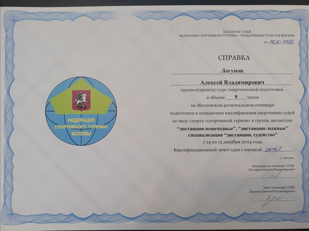 23.12.2024. Заведующий туристско-краеведческим отделом Логунов Алексей Владимирович успешно сдал квалификационный зачет на третью судейскую категорию в рамках «Всероссийского и регионального семинара подготовки и повышения квалификации спортивных судей», который проходил в Москве 14 и 15 декабря 2024 года